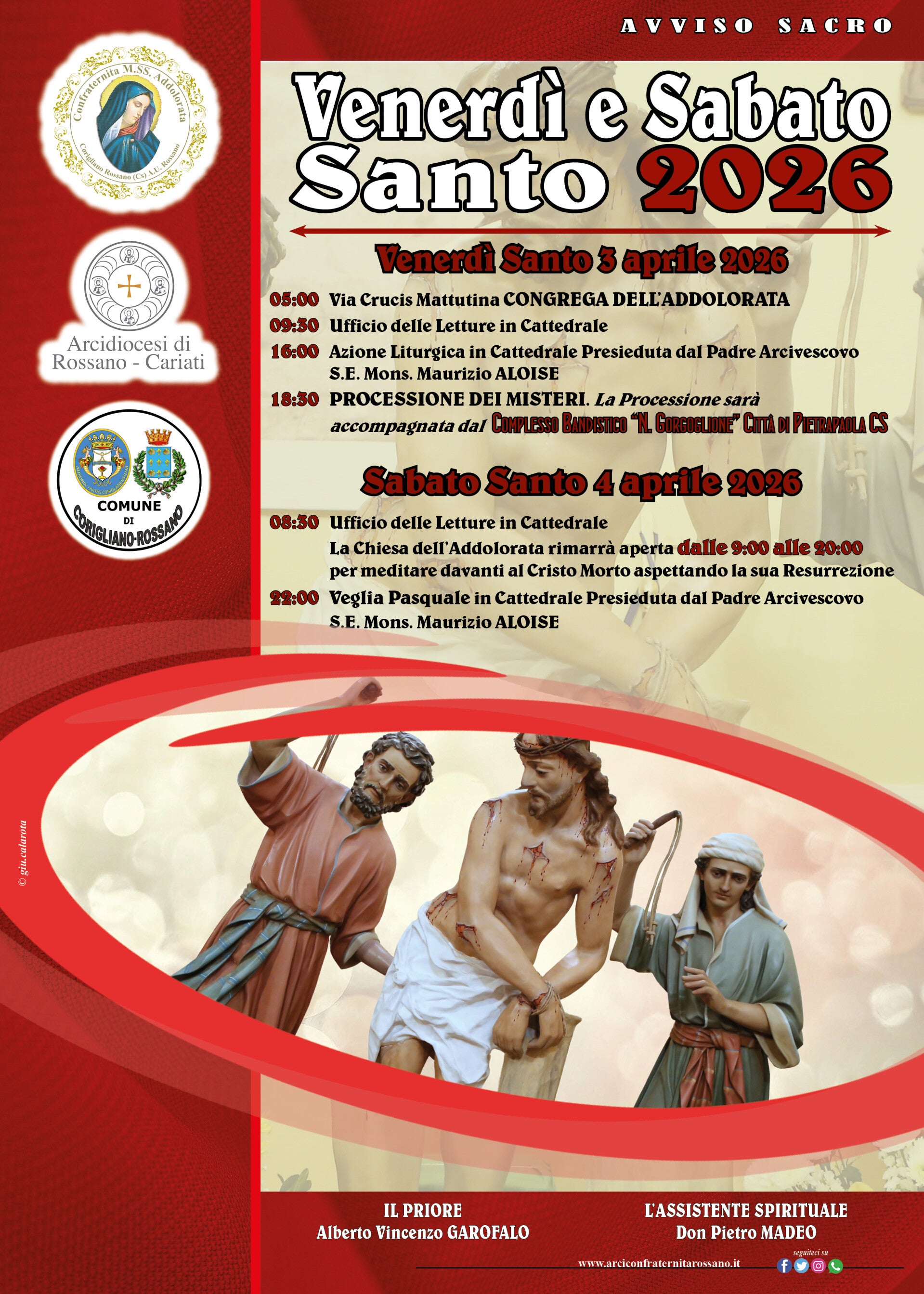 Il cammino Quaresimale della comunità di Corigliano Rossano (a.u. Rossano) si arricchisce di un momento di profonda spiritualità e devozione. Venerdì 20 marzo 2026, in occasione del 5° Venerdì di Quaresima, la Confraternita M.SS. Addolorata vivrà un momento centrale nelle celebrazioni della Passione. Le celebrazioni avranno inizio presso la Cattedrale Maria SS. Achiropita alle ore 18:00. Il momento culminante dell'evento sarà la Celebrazione Eucaristica, che quest'anno vedrà una partecipazione particolarmente sentita della Confraternita.