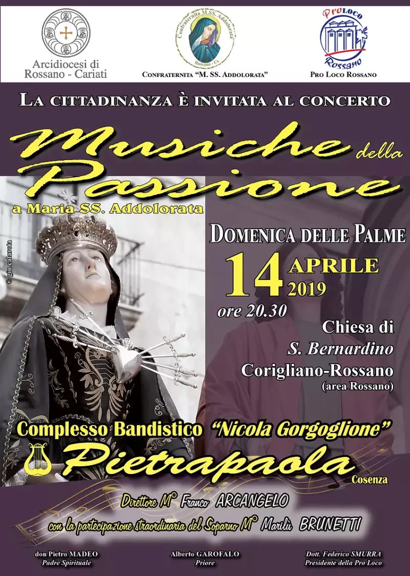 Ad aprire la "grande" Settimana Santa quest'anno, oltre le celebrazioni liturgiche per eccellenza, che ci aiuteranno ad entrare nel clima di riflessione sulla morte e resurrezione di Gesù Cristo, sarà anche la MUSICA. Il 14 aprile, Domenica delle Palme, tutta la cittadinanza è invitata al concerto: "Musiche della Passione ... a Maria SS. Addolorata" presso la chiesa di San Bernardino, (area Rossano Centro Storico), alle ore 20.30. Patrocinato dall'Arcidiocesi di Rossano-Cariati, dalla Confraternita M. SS. Addolorata e dalla Pro loco di Rossano. VI ASPETTIAMO!!!