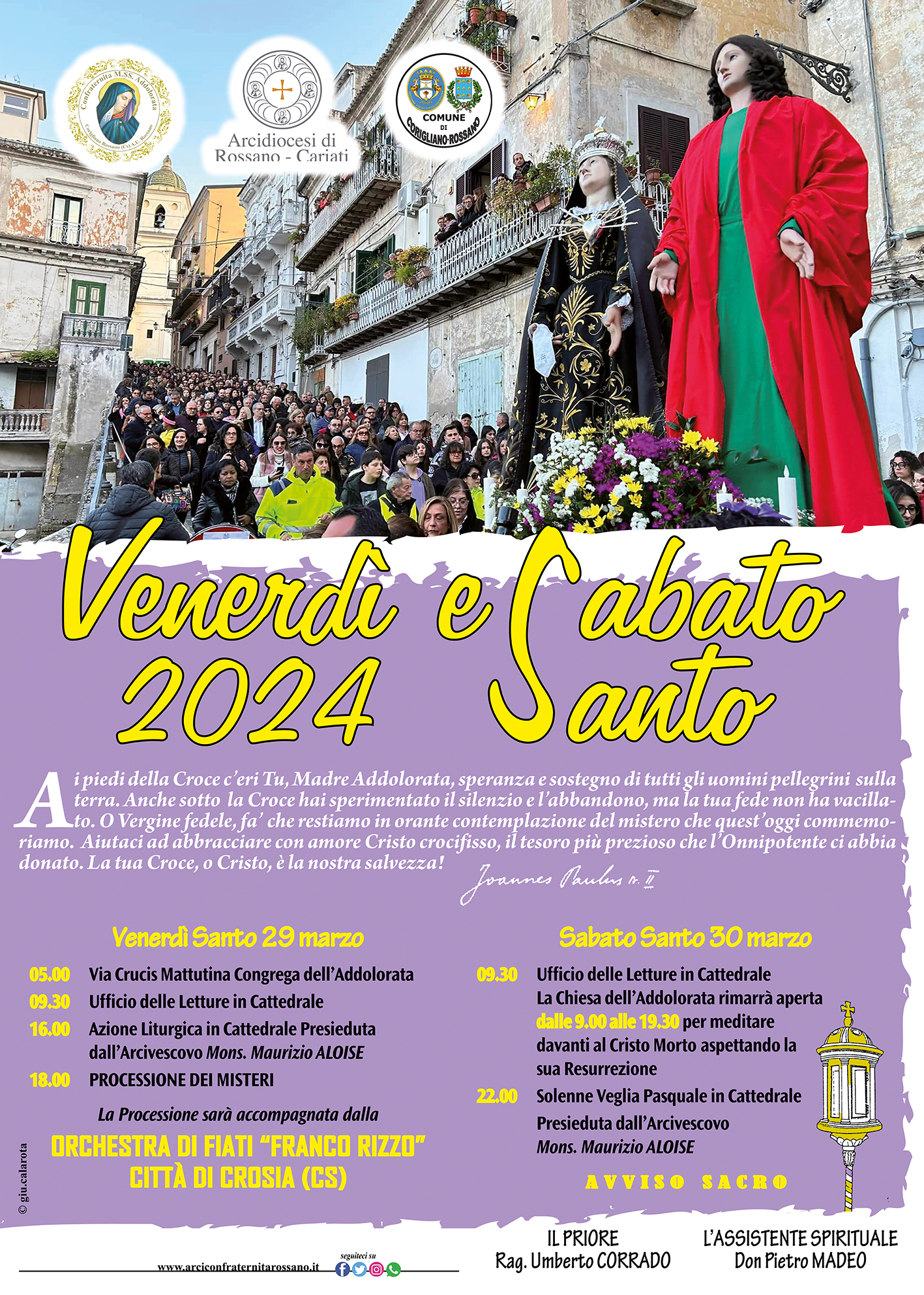 Il Venerdì Santo, invece, già dalle prime luci dell’alba, una marea di fedeli invade le vie di Rossano centro storico, per partecipare alle Congreghe. In tutto sono quattro: San Domenico, l’Addolorata, San Nilo e San Bartolomeo. Il corteo dell’Addolorata/Cattedrale, partirà alle ore 05:00 con un devoto a piedi nudi, incappucciato e con in testa una corona di spine, che porta sulle spalle la Croce. Si visiteranno gli altari della “Reposizione”, cioè i “siburchi". Alle ore 9:30 in Cattedrale, dinanzi a Gesù Eucaristico, sarà celebrato l’Ufficio delle letture e le Lodi mattutine; alle 16:00 sarà la volta dell’Azione Liturgica in Cattedrale presieduta dall’Arcivescovo Mons. Maurizio Aloise, a seguire la tradizionale Processione dei Misteri alle ore 18.00, che attraverserà le vie del Centro Storico, accompagnata dall’Orchestra di Fiati “Franco Rizzo” Città di Crosia (CS).