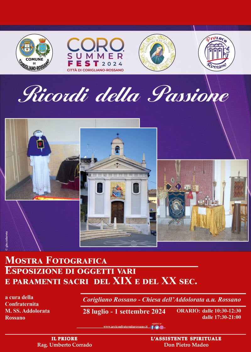 La Confraternita dell’Addolorata dell’a.u. di Rossano ha voluto inserire nel cartellone CORO Summer Fest 2024 Città di Corigliano Rossano, una mostra sui “Ricordi della Passione”.
