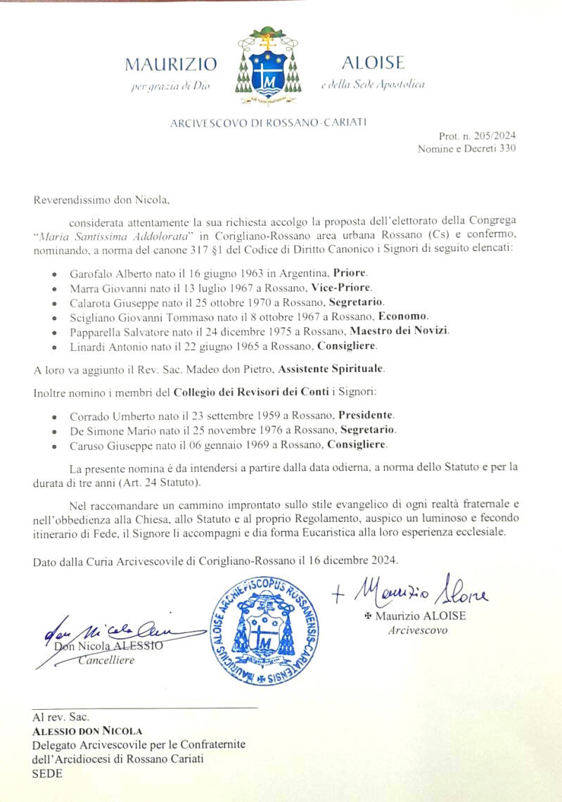 Il Consiglio direttivo è così formato da Alberto Vincenzo GAROFALO (Priore), Giovanni MARRA (Vice Priore), Giuseppe CALAROTA (Segretario), Giovanni Tommaso SCIGLIANO (Economo), Salvatore PAPPARELLA (Maestro dei Novizi), Antonio LINARDI (Consigliere), Don Pietro MADEO (Assistente Spirituale).